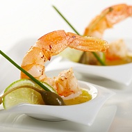 Тигровые креветки получили свое название благодаря специфичной раскраске - чёрным полоскам на панцире. Спинку у креветок стоит разрезать. Это считается хорошим тоном, а заодно вытаскивается «черная нить». Маринованные в оливковом масле и обжаренные креветки с великолепным желе из манго и горьким шоколадом – идеальное сочетание, вкусовая композиция!